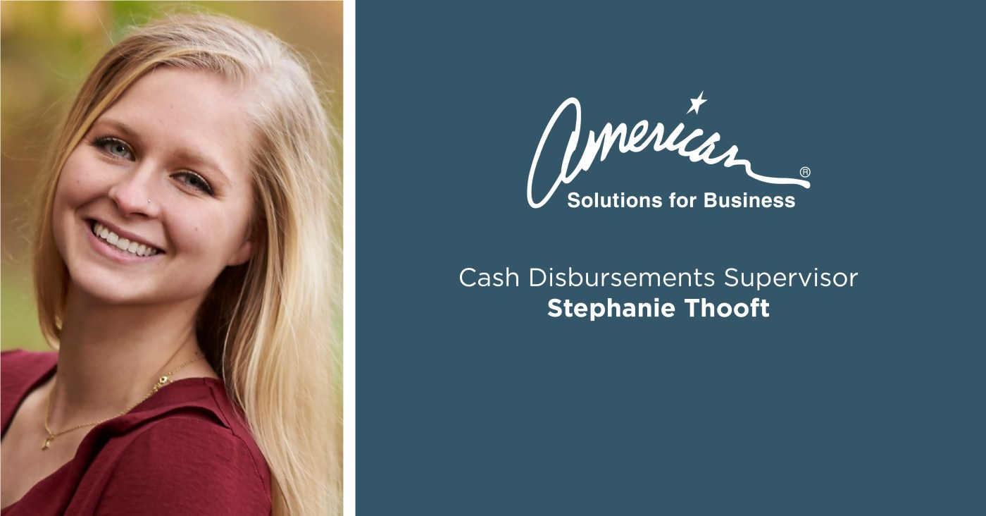American Solutions for Business is excited to announce the promotion of Stephanie Thooft to Cash Disbursements Supervisor.