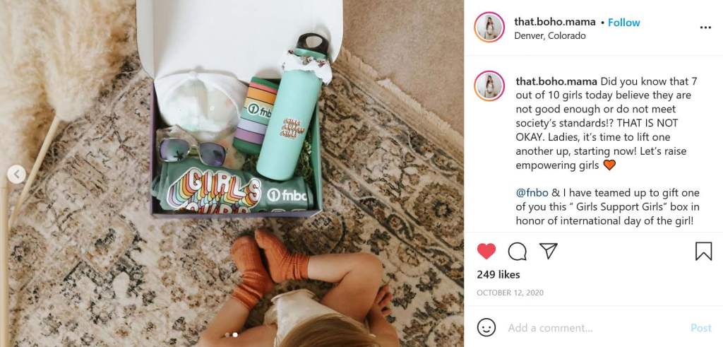 “We have learned that unboxing giveaways are often much more successful than even giving away cash,” explained FNBO representative, Bridget Hadfield. “People love to win swag! We sent bright, bold, and fun curated boxes to the influencers, one for them and one to giveaway to one of their followers.”