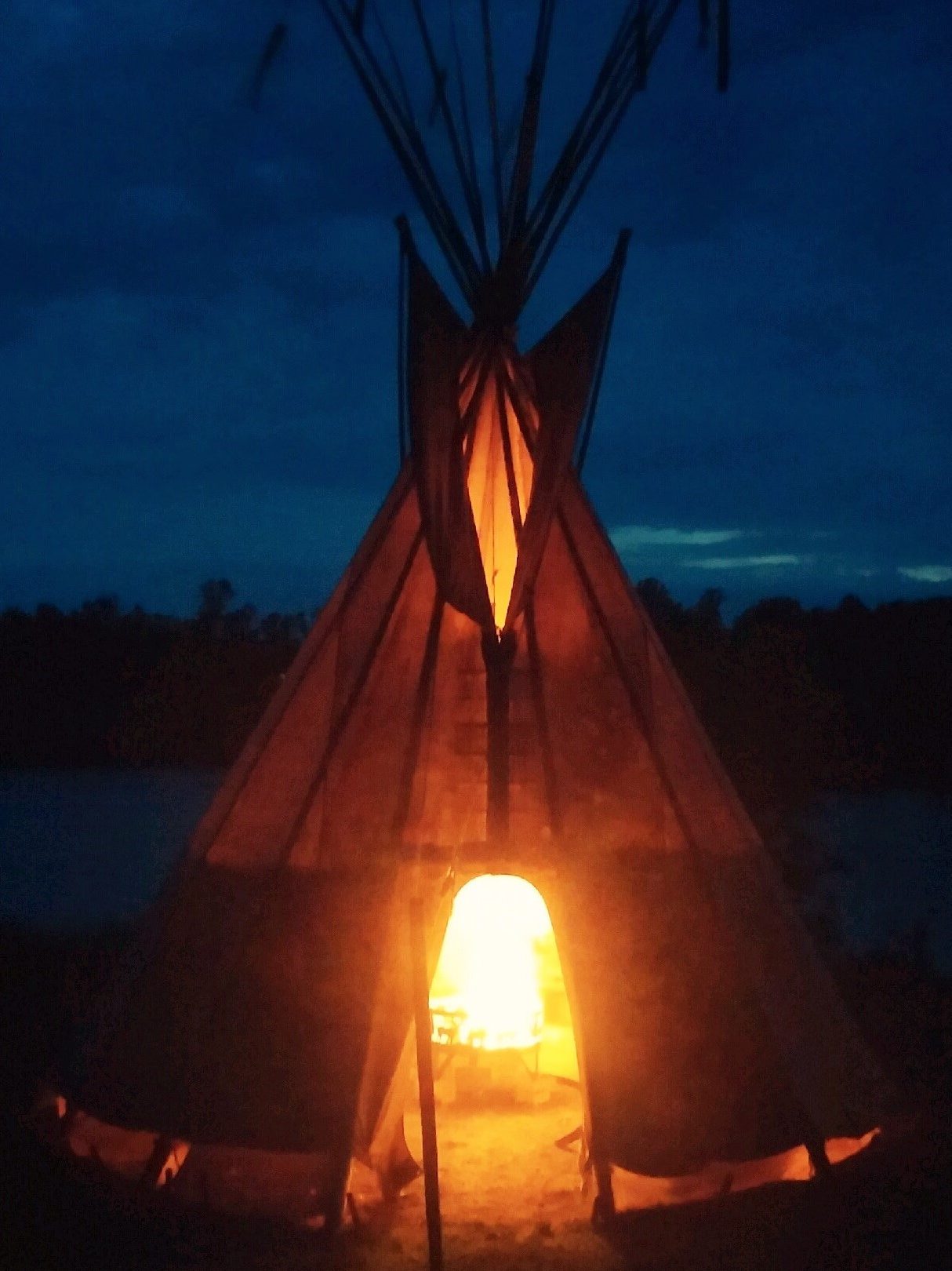 Shannon: We live on the river just out of Chippewa Falls and we have a teepee. My husband’s uncles got into the rendezvous era and wanted to get a teepee and put it on our land. It’s honestly a landmark at this point. We have fires in it all the time. My husband cuts and peels the trees by hand to put the teepee together.