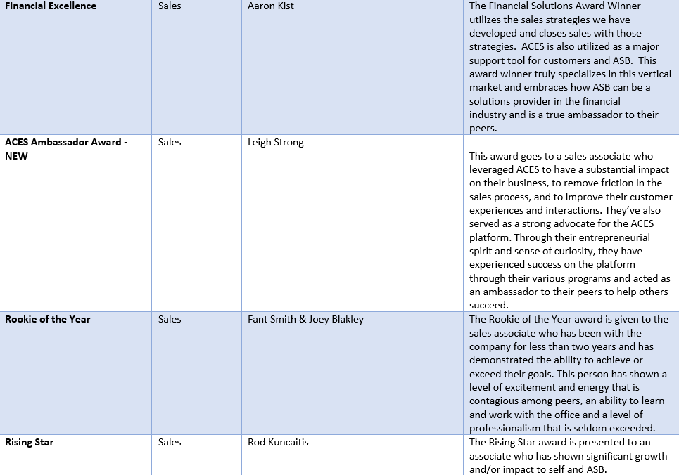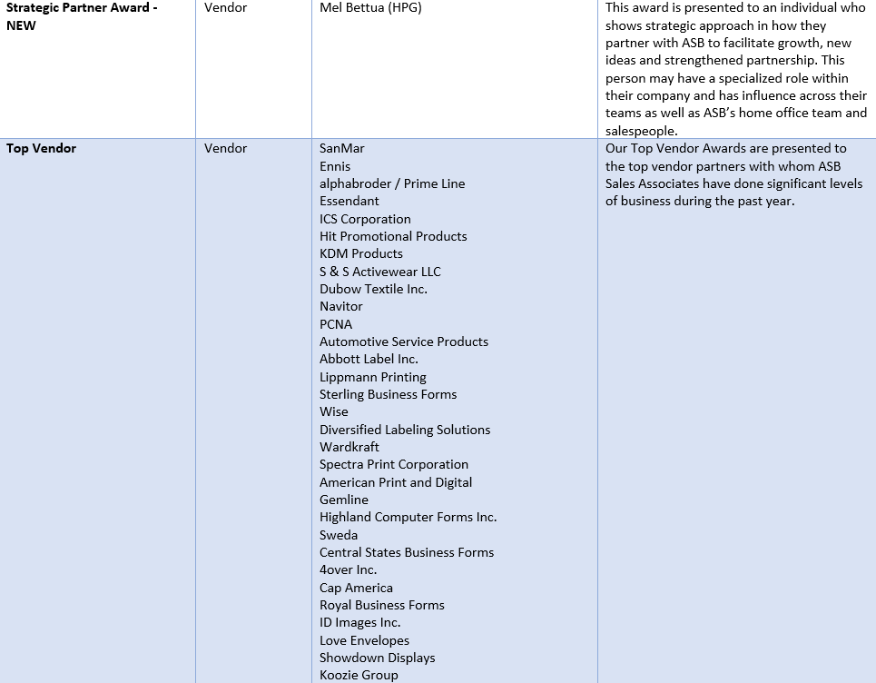 “It’s truly remarkable the heights that our ASB family and vendor partners reach each year!” expressed Larry Zavadil. “We get to celebrate the hard work these individuals and groups exhibit daily, and we look forward to continuing it for years to come.”