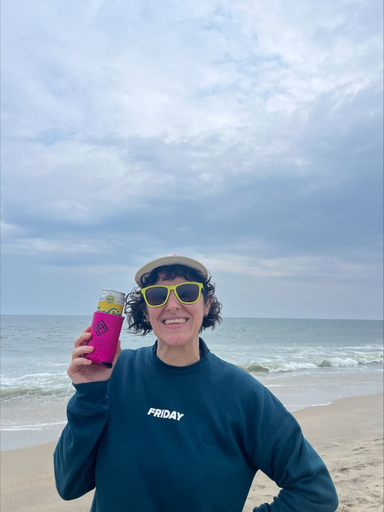 “Sometimes a day at the beach isn’t all fun in the sun. Having a cozy sweatshirt to keep warm in the wind (and rain!) and a can cooler to keep my hands warm when holding a frosty beverage helps keeps the vibes positive!”